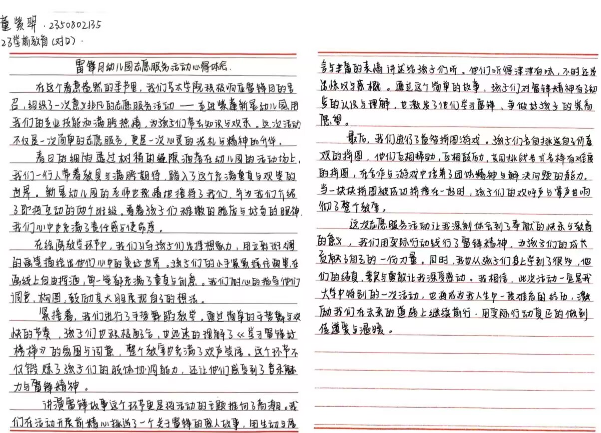 雷锋月里,董紫羿所在的艺术学院走进紫蓬新星幼儿园开展志愿活动。他们教孩子们绘画、舞蹈,讲述雷锋故事,还组织拼图游戏。活动中,孩子们积极参与,收获知识与快乐。董紫羿等人不仅践行了雷锋精神,也被孩子们的纯真所打动,这段经历对他们意义深远 。