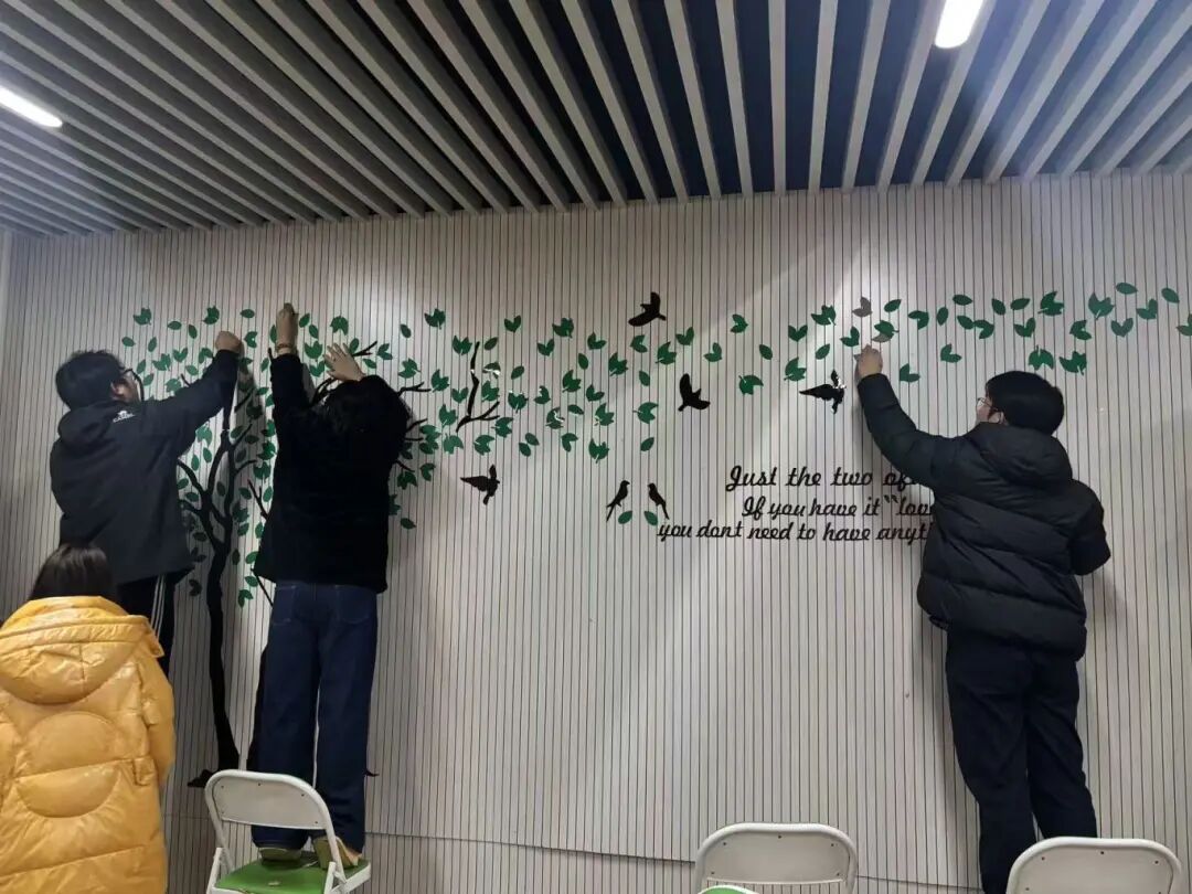 心理研究表明,舒适、积极、个性化的环境能有效降低个体的焦虑感,提升安全感与放松水平。本次装饰活动正是这一理念的生动实践。树木所代表的自然元素与生机,爱心所承载的情感联结,共同构建了一个更具心理安抚功能和情感支持意义的物理空间,为后续在此开展的团体辅导、交流活动奠定了良好的环境基础。