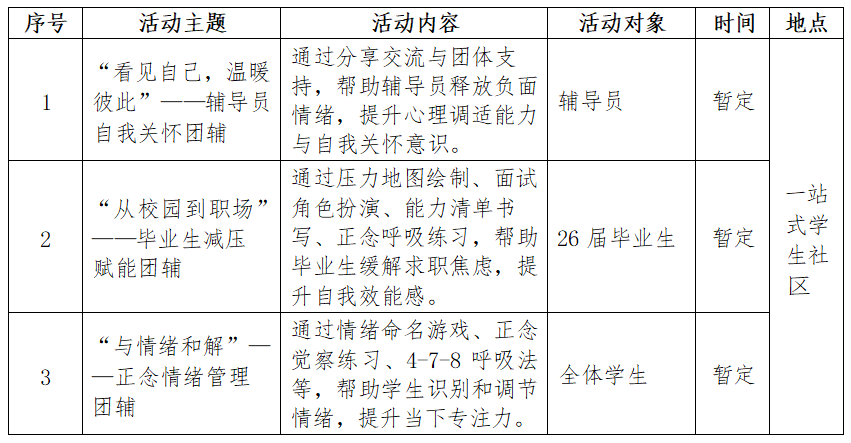 (2)活动内容与意义:“心相伴”系列团体辅导以陪伴式成长为核心,通过互动体验、分享交流、情绪觉察与人际支持等多种形式,引导参与者在安全包容的团体氛围中认识自我、表达情绪、学习沟通技巧,缓解心理压力,增强自我接纳与心理调适能力。具体安排见下表。