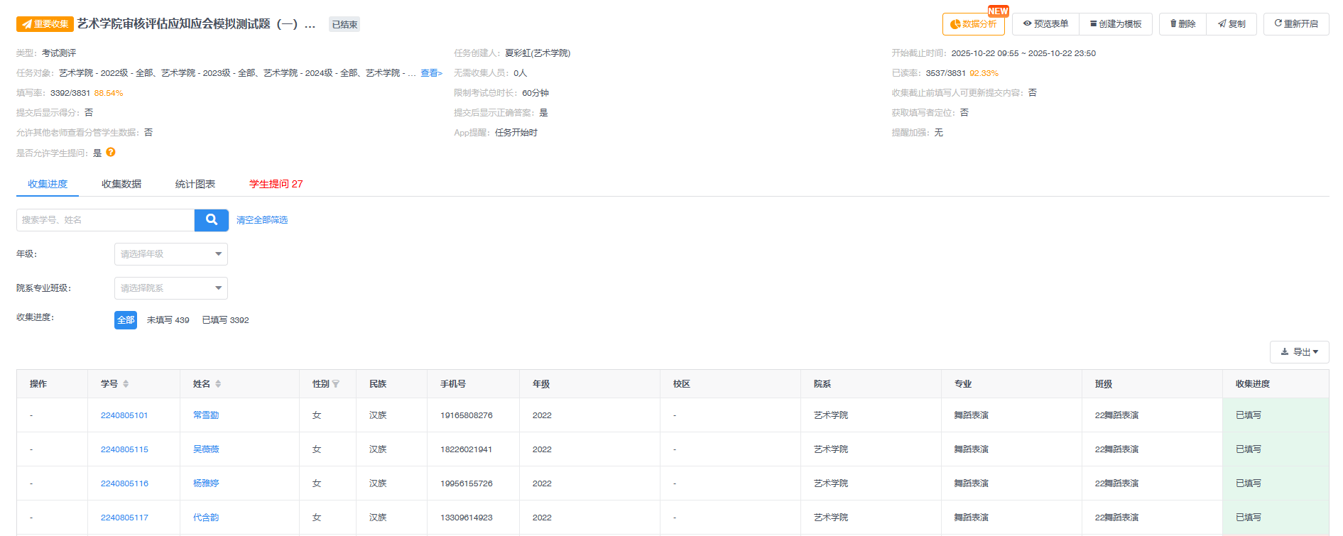 为检验学习成效,巩固知识要点,学院创新利用线上平台,推出了“审核评估应知应会”在线知识测试。测试题库紧扣学生手册内容,涵盖评估基本知识、校情院情、学风建设、行为规范等多个方面。全院学生积极响应,踊跃参与,在限定时间内完成答题。线上测试的形式便捷高效,不仅方便了同学们利用碎片化时间进行自测,也通过即时反馈的成绩和解析,帮助大家快速准确地发现知识盲点,有针对性地进行复习巩固。这一环节极大地激发了学生的学习主动性和竞争意识,实现了“以考促学、以学促知”的良好效果,确保了应知应会知识入脑入心。