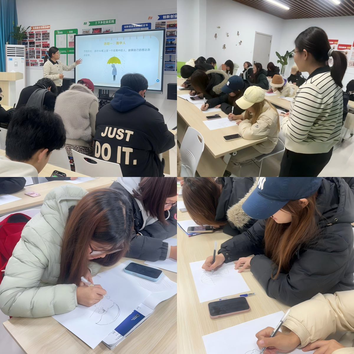 在“雨中人”绘画活动中,同学们在老师的引导下,通过画笔将自己心中“雨中的自己”具象化,用线条、色彩传递内心的压力状态与情绪感受。绘画完成后,同学们自愿分享自己的作品内涵,陈灿然、代萍老师耐心倾听每一位同学的表达,针对性地给予情绪疏导与心理支持,帮助同学们更清晰地觉察自身压力来源,学会正视压力。