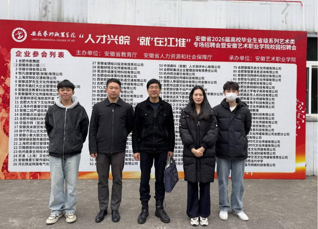 为持续推进“访企拓岗促就业”专项行动走深走实,精准掌握用人单位需求,开拓优质就业岗位,2025年12月12日,艺术学院党总支副书记夏源江、毕业班辅导员贾芮、李俊松和毕业生代表一行人前往安徽艺术职业学院参加企业进校园人才招聘会,与合肥市轨道交通集团有限公司、安徽圣赫体育有限公司、华强方特(芜湖)文化科技有限公司、上海羿铁轨道交通有限公司、语亨(上海)文化传媒有限公司、祥源控股集团有限责任公司、安徽十里红妆旅游开发有限公司、海澜之家集团股份有限公司合肥分公司、安徽新黑码文化发展有限公司、六安市皖西当代教育管理有限公司、寿县苗苗舞韵艺术培训学校有限公司、合肥积木互娱文化传媒有限公司、艺朝艺夕教育科技集团有限公司等13家企业进行交流洽谈,并初步达成合作意向。