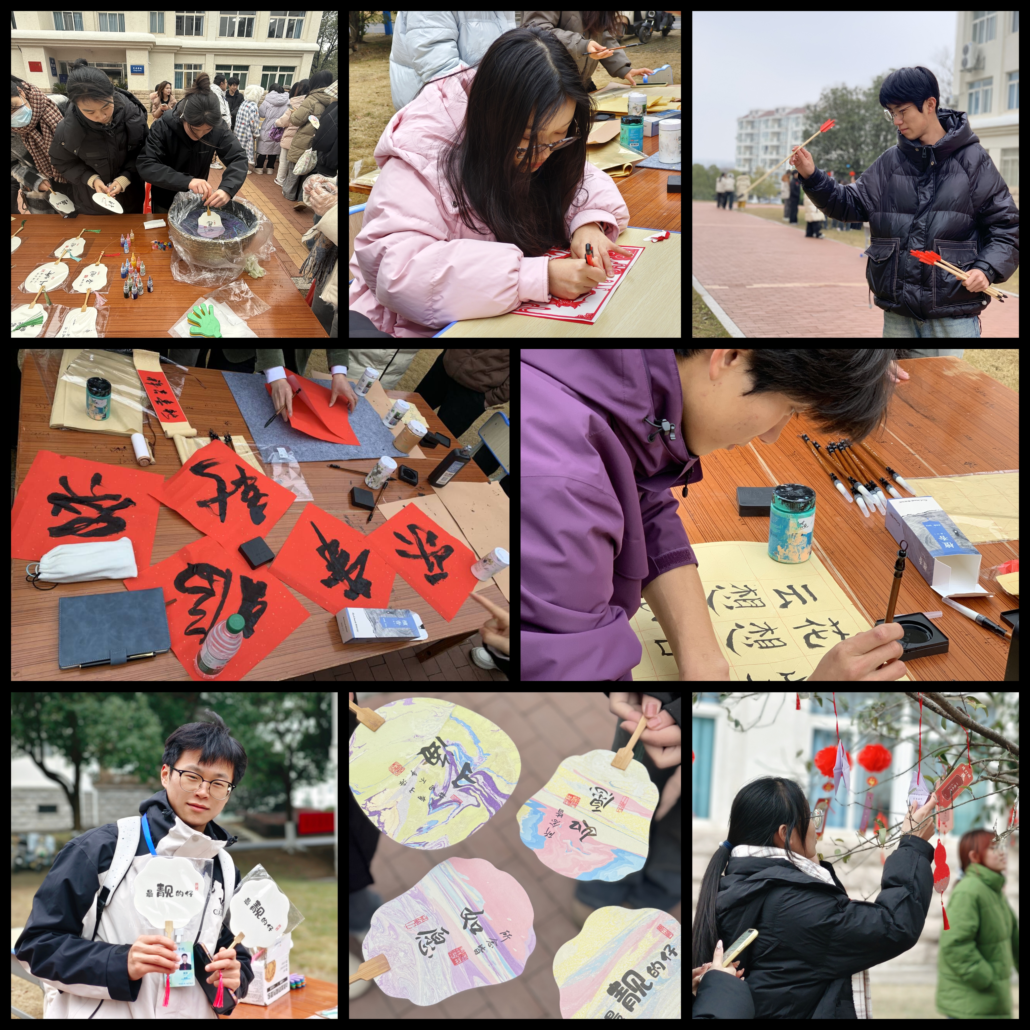 “共织华夏韵,民族欢乐荟”活动在振宁楼与稼先楼之间开展。活动现场设置了猜灯谜、剪窗花、投壶、书法创作等多个传统文化体验区,学生穿梭其间,踊跃参与。猜灯谜区域悬挂着精心制作的谜题卡片,同学们驻足思考、交流答案;剪窗花区域大家巧手翻飞,创作出各式吉祥图案;投壶区更是欢声不断,同学们在传统游戏中感受礼乐风采。活动特别设置了“漆扇制作”奖励环节,激励同学们在各项活动中积极表现,共有30名同学通过优异表现获得了亲手制作漆扇的机会,进一步增强了活动的趣味性与参与感。