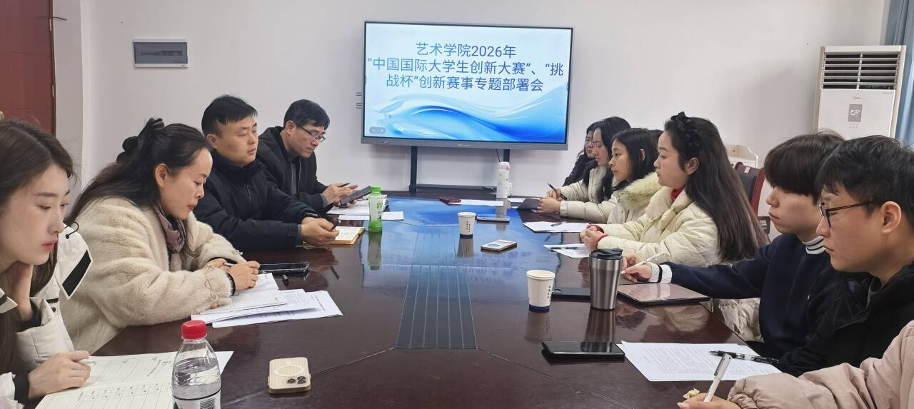 为激发艺术学子的创新精神、创业意识与创造能力,积极投身创新创业实践,积极响应校团委工作要求,1月29日,艺术学院召开2026年中国国际大学生创新创业大赛与“挑战杯”竞赛专题工作部署会,学院党总支书记杨静、副书记夏源江、院长助理卫浩及全体辅导员参会。本次会议由杨静主持。