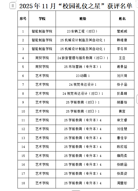 根据《关于开展“对标审核评估 强化学风建设”主题教育活动的通知》(学函〔2025〕62号)中“礼仪践行打卡”线上活动要求,经学生自主申报、完成30天礼仪践行打卡,二级学院初审推荐,学生处复核评审,现确定2025年11月“校园礼仪之星”获评名单(详见附件),予以公示。