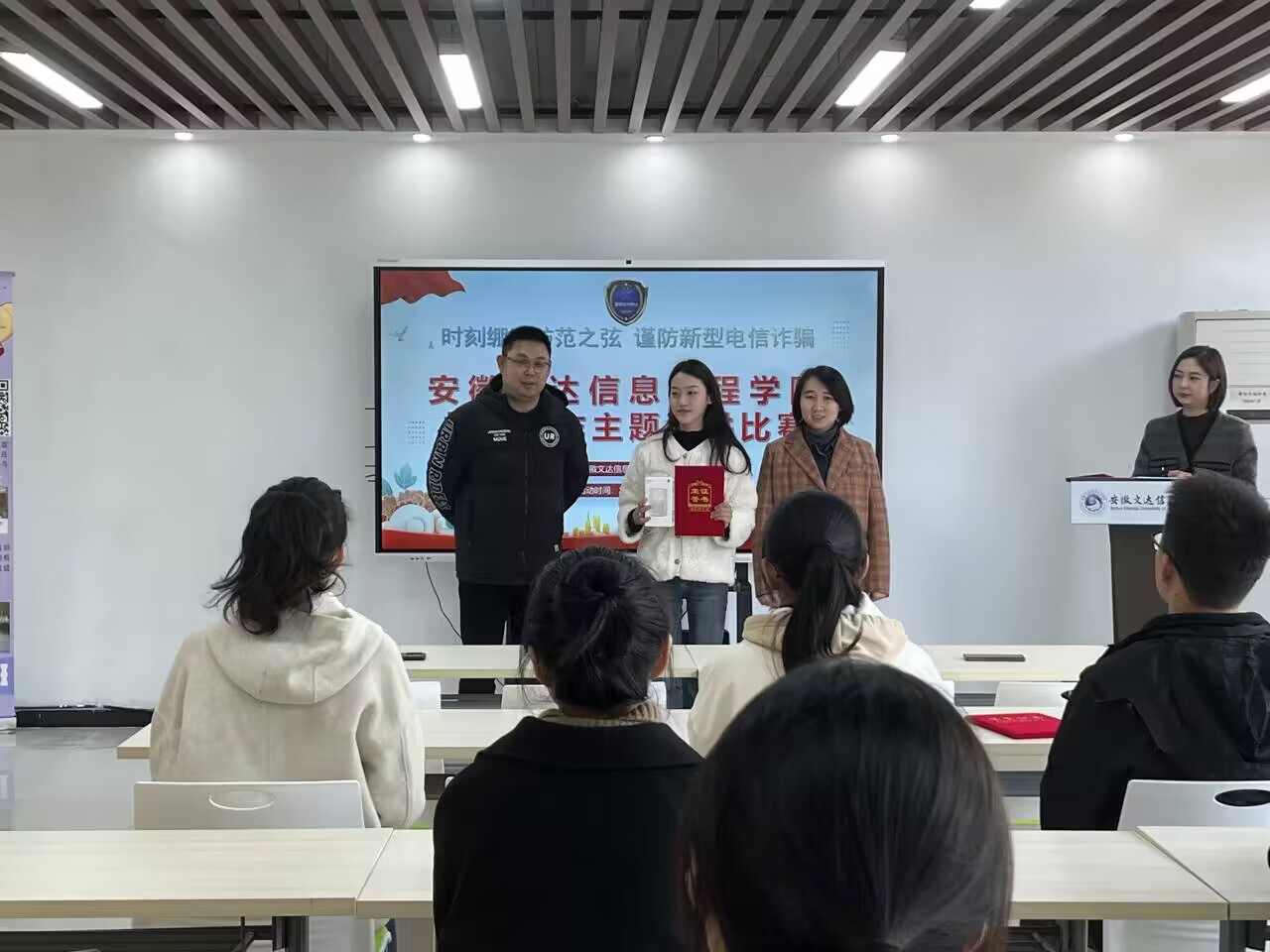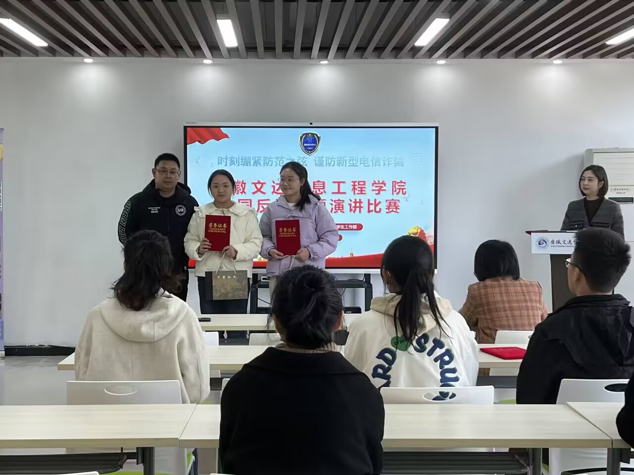 为进一步加强防范网络电信诈骗宣传教育,提升学生反诈防骗意识和能力,充分调动青年学生参与全民反诈工作的积极性和创造性,保护学生财产安全,创建平安校园,学校于11月举办了首届校园反诈主题演讲比赛。本次大赛由学生工作部主办,各二级学院承办,经过个人报名、二级学院遴选推荐、校级评审组终评三个阶段完美落幕,11月17日中午,在17、18栋“一站式”学生社区举办安徽文达信息工程学院校园反诈主题演讲比赛颁奖仪式,学生工作部副部长王玺、学生管理科何宛竹、思想政治教育科李梦参加本次活动。