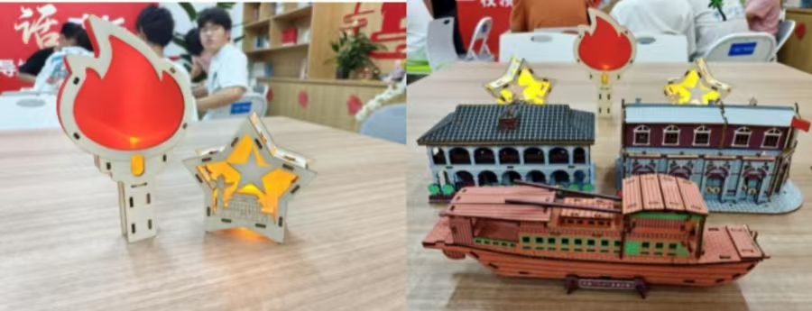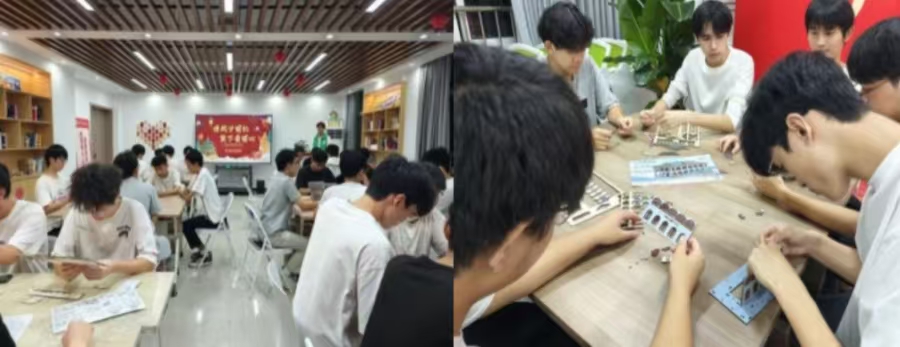 活动在庄严的国家发展历程短片回眸中拉开序幕。同学们两两一组,协作拼装“星星向党”“红船”“遵义会议”等主题DIY作品。一拼一接间,红色符号悄然具象,民族精神与时代使命随之深刻烙印于心。现场中国红映照青春面庞,气氛热烈而专注。