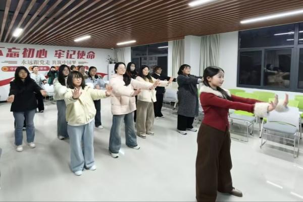 随后,领操员带领大家进入室内青春养生操环节。大家跟随指导舒展身体,通过扩胸、转颈、扭腰等轻柔动作,缓解久坐疲劳、释放学习压力,工作人员在旁适时纠正姿势,现场氛围轻松愉悦。