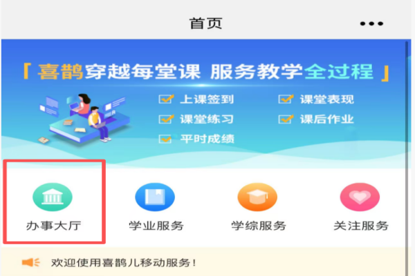 步骤一:使用手机喜鹊儿app端,进入办事大厅。