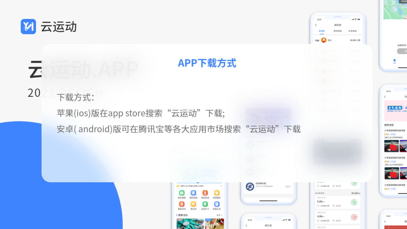 “云运动APP”锻炼需要使用智能手机。开始锻炼前, 通过手机应用市场上搜索“云运动”APP并下载;华为、小米、oppo、vivo手机助手等各大商店下载;苹果用户:app store下载。具体使用方法请详细参看附件中的“云运动APP使用说明”。