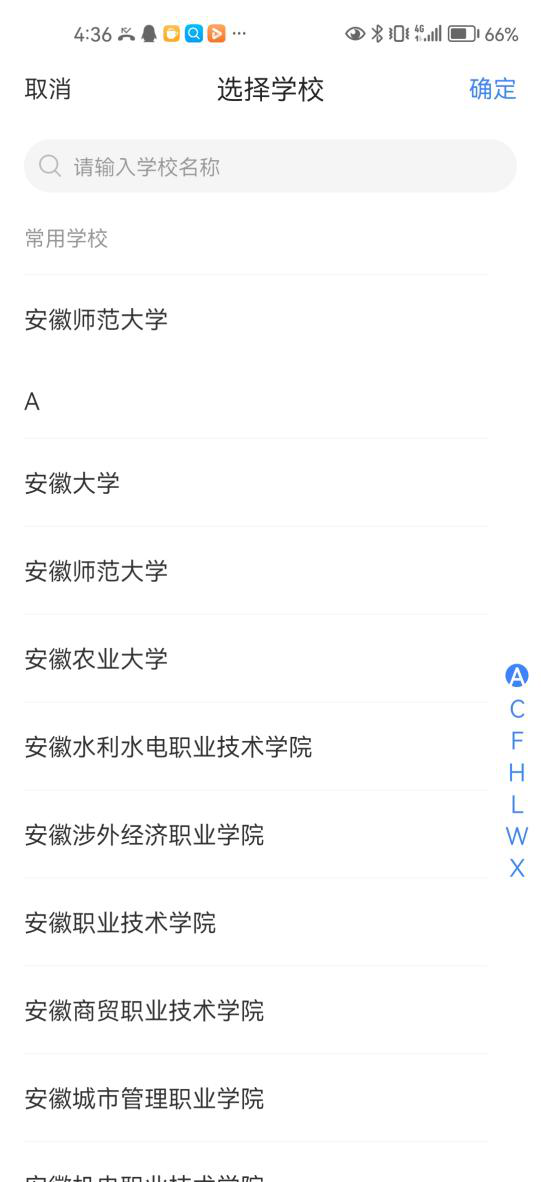 2、登录页(请同学们选择自已的学校进行登录。用户名是自已的学号,密码是默认学号后六位,初次登录APP会提示更改自已的默认密码,请同学们一定要记得修改。)
