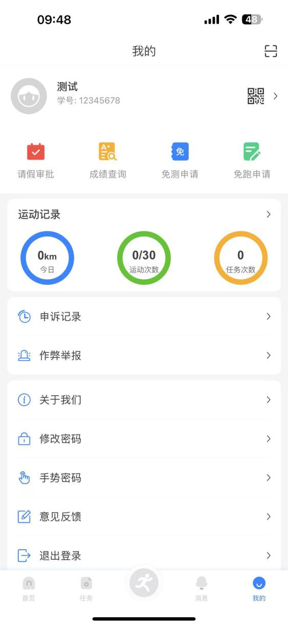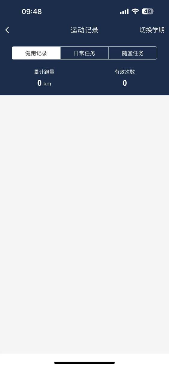 请点击“我的”菜单按钮进入页面查询该学期以及大学往年的健跑记录成绩如图以下: