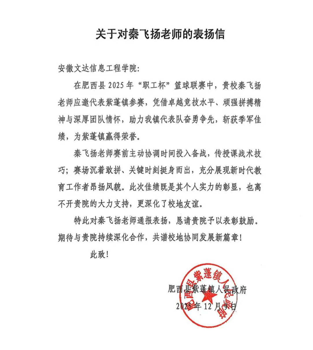 近日,体育教学部直属党支部收到来自肥西县紫蓬镇人民政府的表扬信,对我支部教师秦飞扬同志在肥西县2025年“职工杯”篮球联赛中的突出表现予以通报表扬。