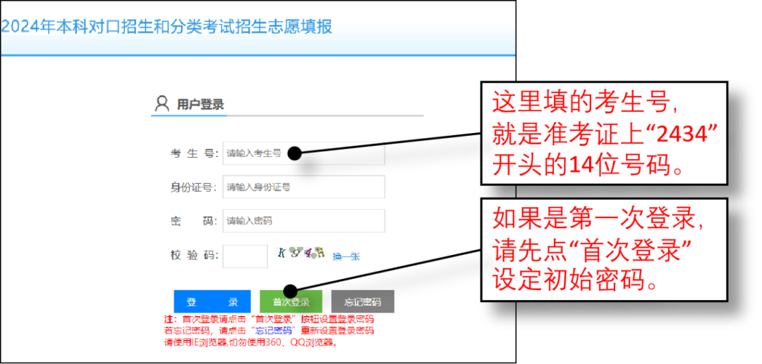 4. 首次登录和志愿提交时均会发送短信验证码,如遇无法接收短信验证码、遗忘考生号、更换了手机号码或号码有误等问题,请联系报名点或当地招办及时处理,以免耽误志愿填报。