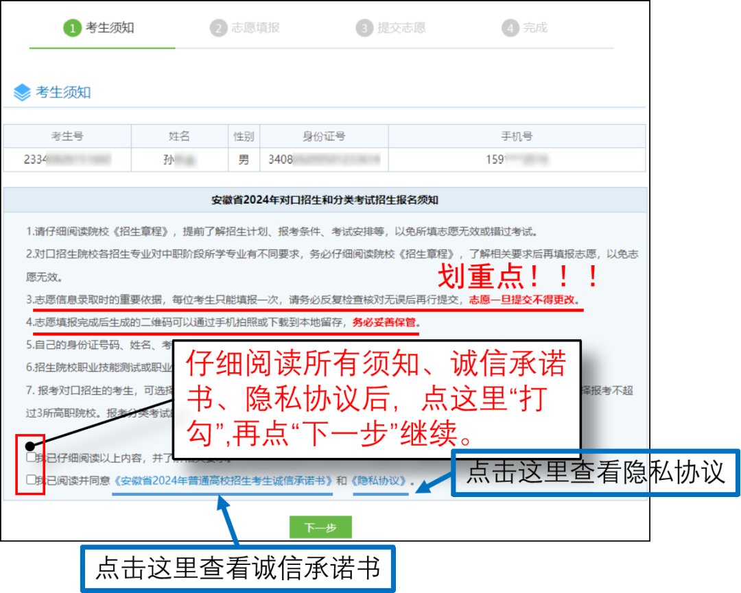 4. 仔细阅读考生须知、《安徽省2024年普通高校招生考生诚信承诺书》《隐私协议》后,在小方框中“打勾”,点击“下一步”继续填报。点击了“下一步”即表示你知晓并认可相关要求。